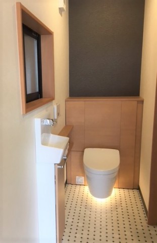 床のクッションフロア、壁紙、独立手洗いもリフォームされたので